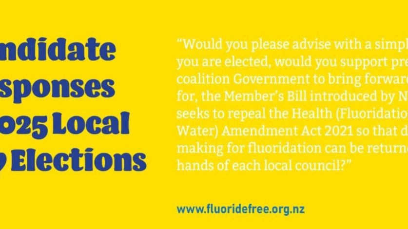 Candidate Responses in 2025 Local Body Elections Would you please advise with a simple yes or no – if you are elected, would you support pressuring the coalition Government to bring forward, and vote for, the Member’s Bill introduced by NZ First, which seeks to repeal the Health (Fluoridation of Drinking Water) Amendment Act 2021…