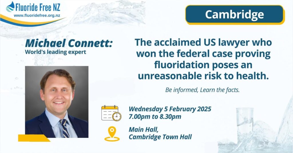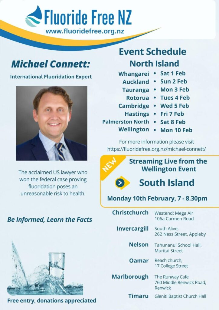 Dr Denholm Crone, retired Intensive Care Specialist and former Medical Director of St John’s Ambulance Auckland, and Mary Byrne from Fluoride Free NZ will be presenting.